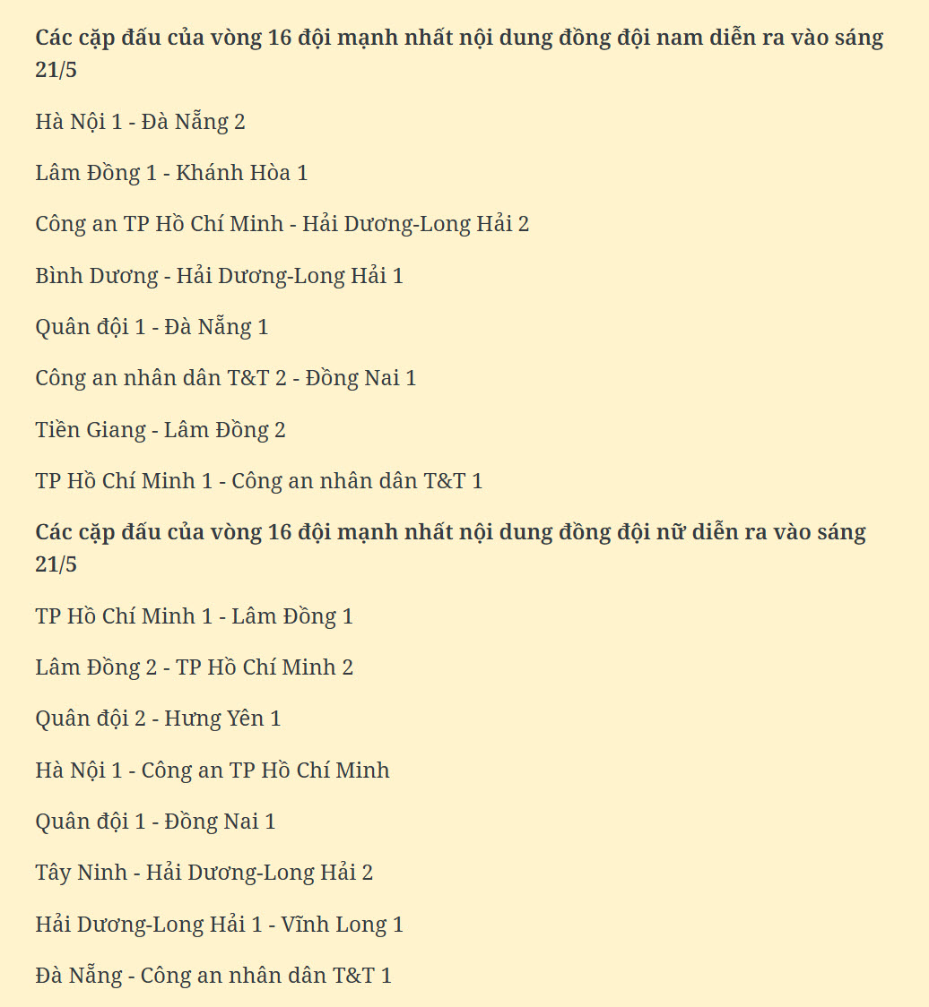 Ở nội dung đồng đội nữ, các “đại gia” của làng bóng bàn nữ Việt Nam như TP Hồ Chí Minh 1, Công an nhân dân T&T 1, Hà Nội 1, Hải Dương-Long Hải 1 và Quân đội 1 đều có những chiến thắng thuyết phục, sớm giành quyền vào vòng 16 đội mạnh nhất.