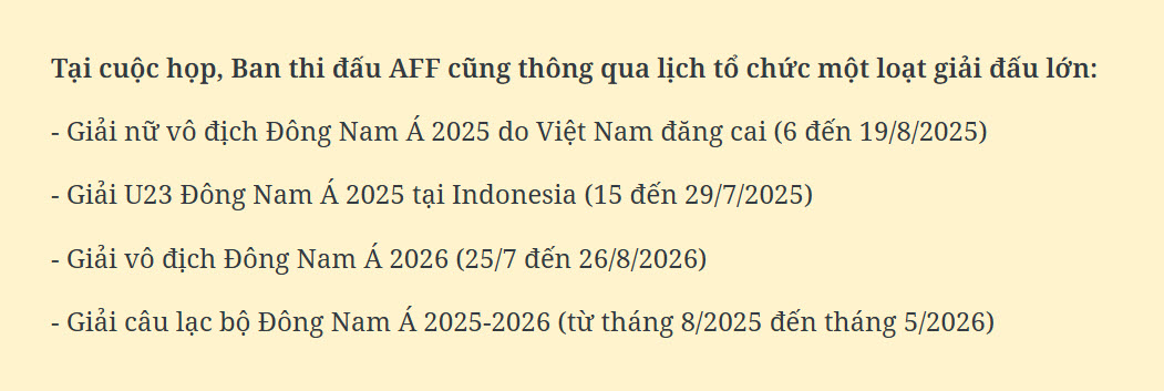 Sáng 21/5, tại Bangkok (Thái Lan), Ban thi đấu Liên đoàn Bóng đá Đông Nam Á (AFF) đã họp để thông qua kế hoạch tổ chức các giải bóng đá trong phần còn lại của năm 2025 và năm 2026. Cuộc họp do ông Trần Quốc Tuấn - Chủ tịch Liên đoàn Bóng đá Việt Nam, Trưởng Ban thi đấu AFF chủ trì. Trong số các nội dung quan trọng, tâm điểm là kế hoạch tổ chức môn bóng đá nam và nữ tại SEA Games 33.