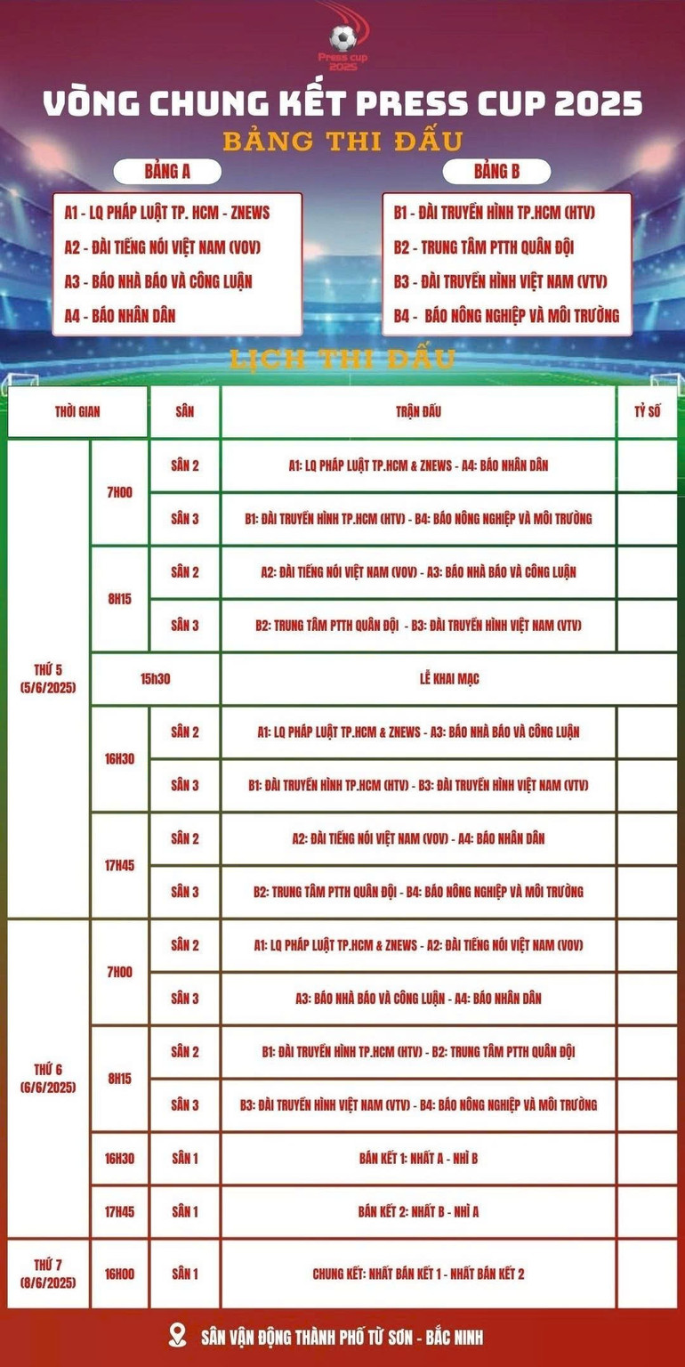 Lễ khai mạc sẽ được tổ chức ngay sau lượt trận đầu tiên, và lễ bế mạc – gala tổng kết sẽ diễn ra vào chiều 7/6, ngay sau trận chung kết. Giải đấu Press Cup 2025 không chỉ là sân chơi thể thao, mà còn là dịp để những người làm báo trong cả nước giao lưu, gắn kết và lan tỏa những giá trị tích cực của nghề báo trong xã hội.