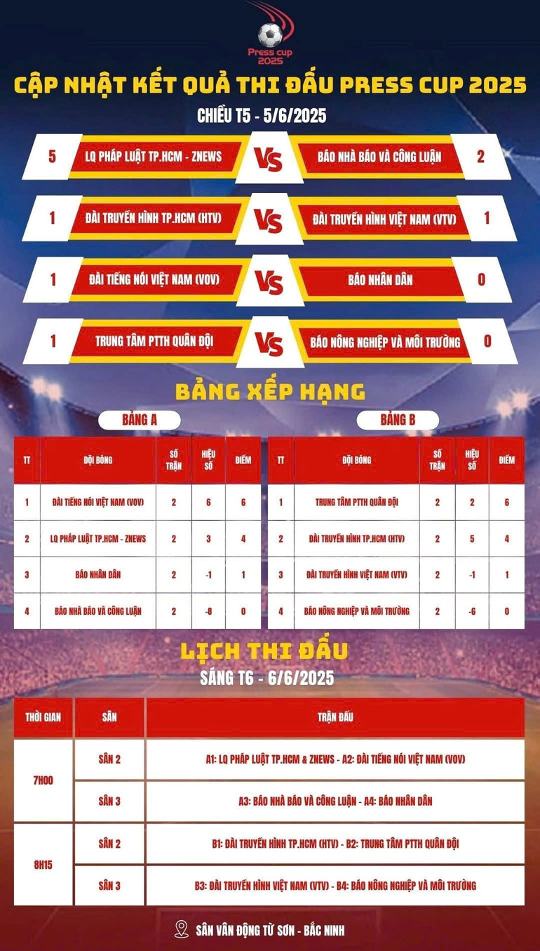 Bảng xếp hạng kết quả ngày thi đấu thứ nhất vòng bảng Press Cup 2025.