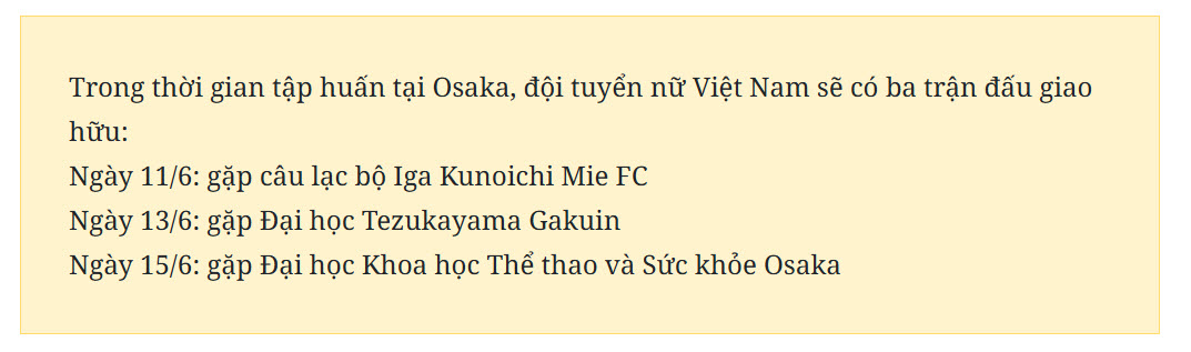 Trong giai đoạn này, đội tuyển nữ Việt Nam đã thi đấu năm trận giao hữu, qua đó từng bước hoàn thiện đội hình. “Tinh thần và thể lực của các cầu thủ đã được nâng lên rõ rệt. Chúng tôi đã ổn định được bộ khung để bước vào đợt tập huấn sắp tới tại Nhật Bản”, ông Chung khẳng định.