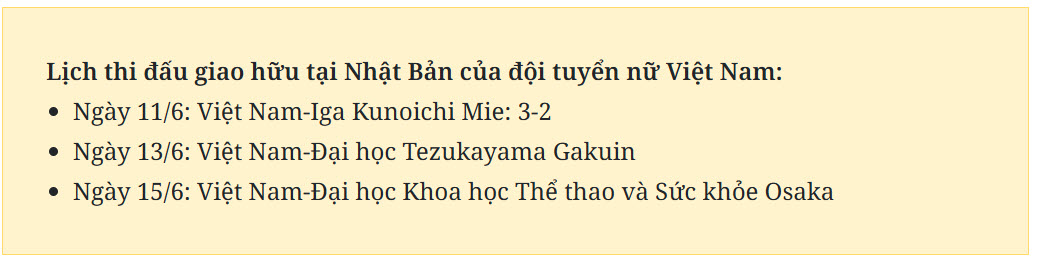 Theo kế hoạch, đội tuyển nữ Việt Nam sẽ tiếp tục thi đấu giao hữu với đội Đại học Tezukayama Gakuin vào ngày 13/6, và gặp Đại học Khoa học Thể thao và Sức khỏe Osaka vào ngày 15/6.
