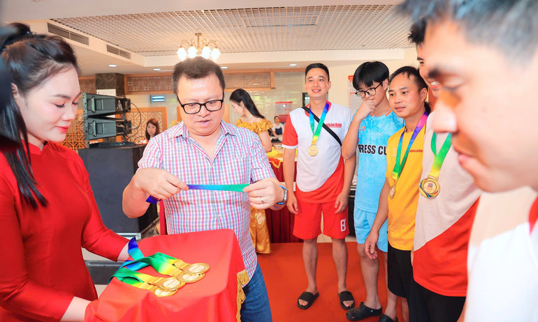 Các đồng chí: Lê Quốc Minh, Tổng Biên tập Báo Nhân Dân; Thuận Hữu, nguyên Tổng Biên tập; Phan Văn Hùng, Phó Tổng Biên tập cùng chia vui và nâng cúp vô địch với đội bóng Báo Nhân Dân.