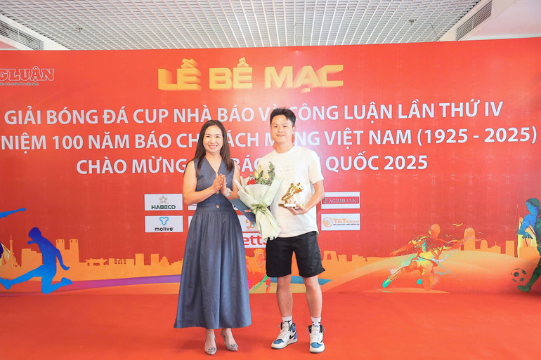 Bà Trần Lan Anh, Phó Tổng Biên tập Thường trực Báo Nhà báo và Công luận, Trưởng Ban tổ chức trao giải Vua phá lưới cho cầu thủ Nguyễn Văn Trung (Tạp chí Đời sống và Pháp luật).