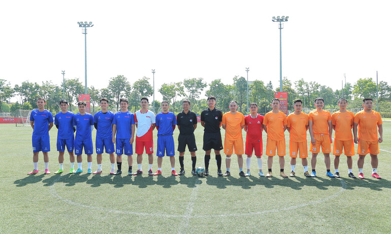 Đội bóng Báo Nhân Dân (áo xanh) và Báo Lao Động (áo cam) chụp hình trước khi vào đá trận chung kết.