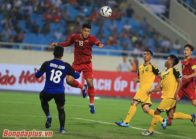 Hà Đức Chinh mở đầu cho chiến thắng tưng bừng của U23 Việt Nam với pha đánh đầu tung lưới Brunei ở phút 11 - Ảnh: Phan Tùng