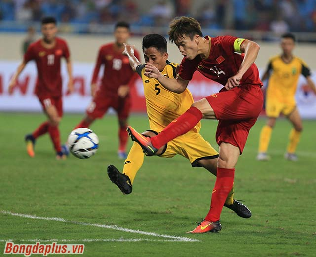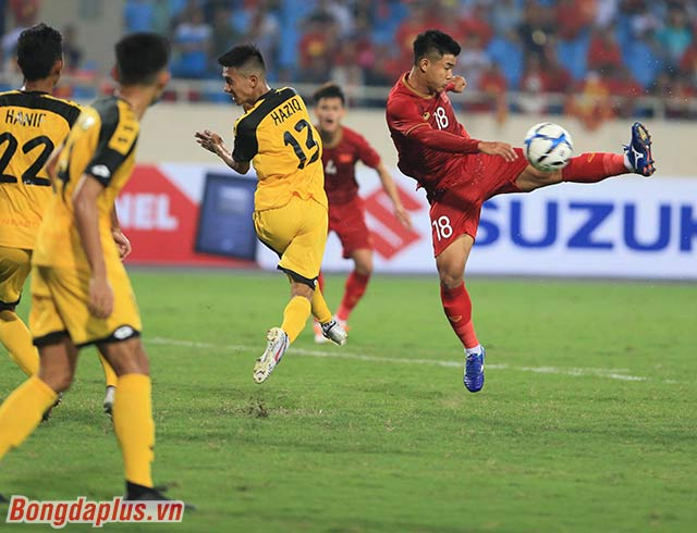 Hà Đức Chinh sau đó còn có pha vô lê đưa bóng trúng cột dọc Brunei - Ảnh: Phan Tùng