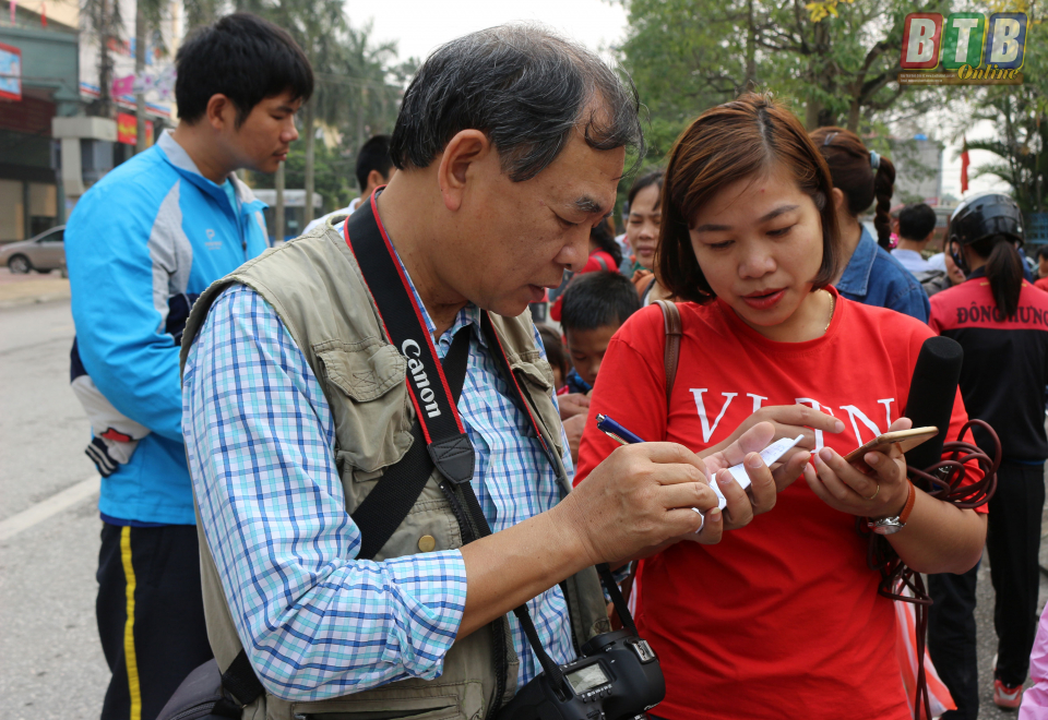 Phóng viên Báo Thái Bình tác nghiệp tại giải việt dã tranh cúp Báo Thái Bình 2019. Ảnh Thanh Thưởng.