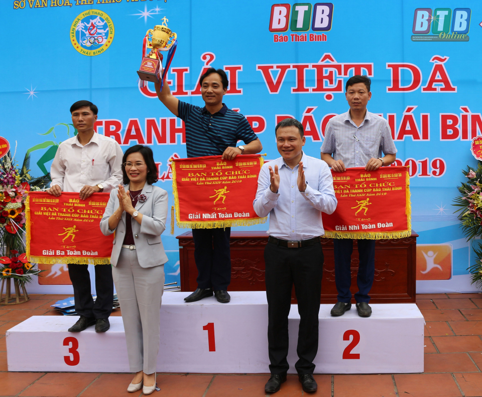 Lãnh đạo Sở VHTT&DL và Báo Thái Bình trao cờ và cúp cho các đội đạt giả nhất, nhì, ba toàn đoàn. Ảnh Thanh Thưởng.