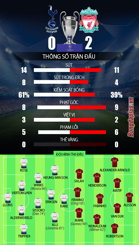 Các bàn thắng của Mohamed Salah và Divock Origi đã giúp Liverpool hạ Tottenham 2-0 để đăng quang Champions League 2018/19. Như vậy, The Kop đã chấm dứt được cơn khát danh hiệu kéo dài 7 năm (lần gần nhất Liverpool bỏ túi 1 chiếc cúp là vào mùa 2011/12 - mùa giải họ vô địch Cúp Liên Đoàn).