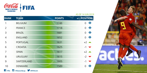 Top 10 trên BXH FIFA tháng 6/2019