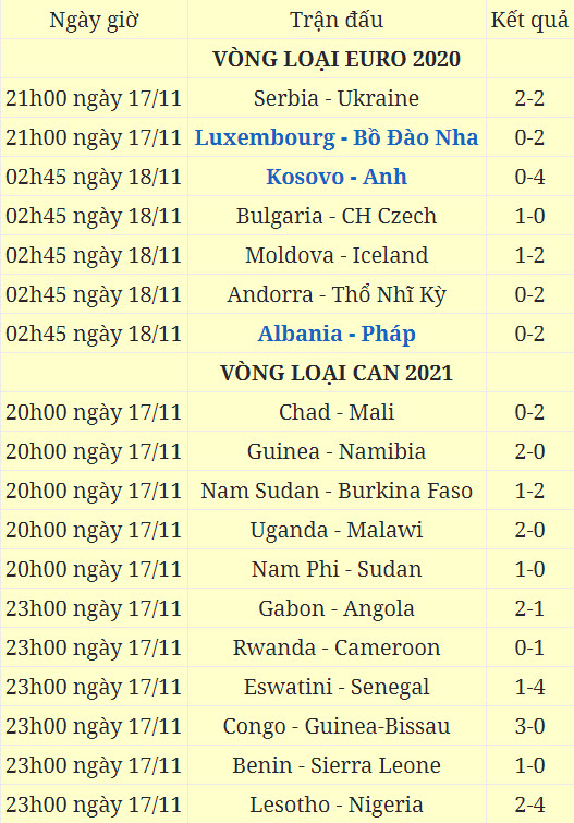 Kết quả loạt trận vòng loại EURO 2020, CAN 2021 đêm 17/11, rạng sáng 18/11.
