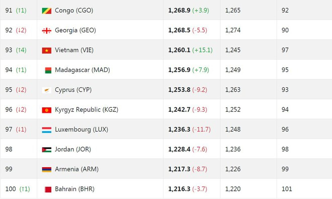 Trên BXH FIFA, ĐT Việt Nam đã nhảy 1 bậc từ 94 lên 93 dù không thi đấu thêm trận nào từ chiến thắng 1-0 trước UAE hôm 14/11. Vị trí này giúp Việt Nam hơn Thái Lan (113) đúng 20 bậc trên BXH FIFA.