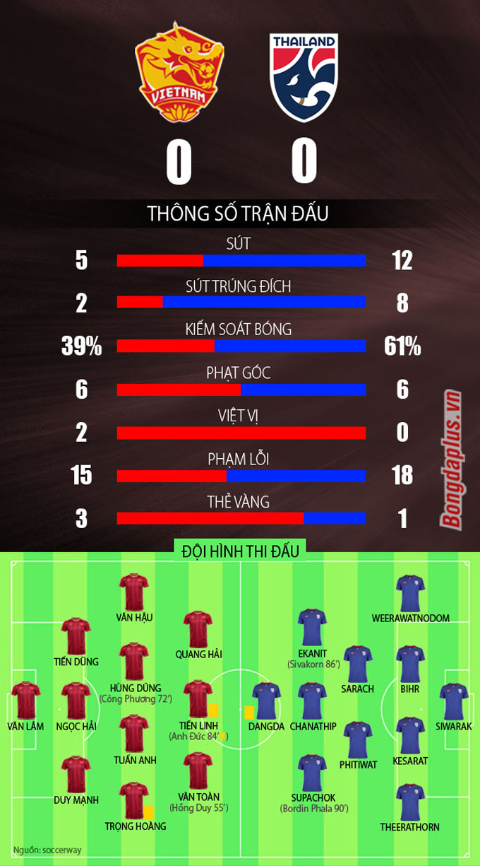 Kết quả thuận lợi trong những lần đối đầu gần đây giúp cho ĐT Việt Nam nhập cuộc với sự tự tin rất lớn trước Thái Lan. Vẫn trung thành với lối chơi phòng ngự phản công nên không khó để lý giải cho việc đoàn quân của ông Park Hang Seo chỉ kiểm soát được 40% so với 60% của Thái Lan về thời lượng bóng trên sân.