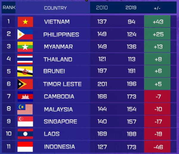 ĐT Việt Nam trở thành đội tuyển Đông Nam Á có sự thăng tiến mạnh mẽ nhất trên bảng xếp hạng FIFA trong 10 năm qua, vượt trên Thái Lan, Malaysia, Philippines hay Indonesia.