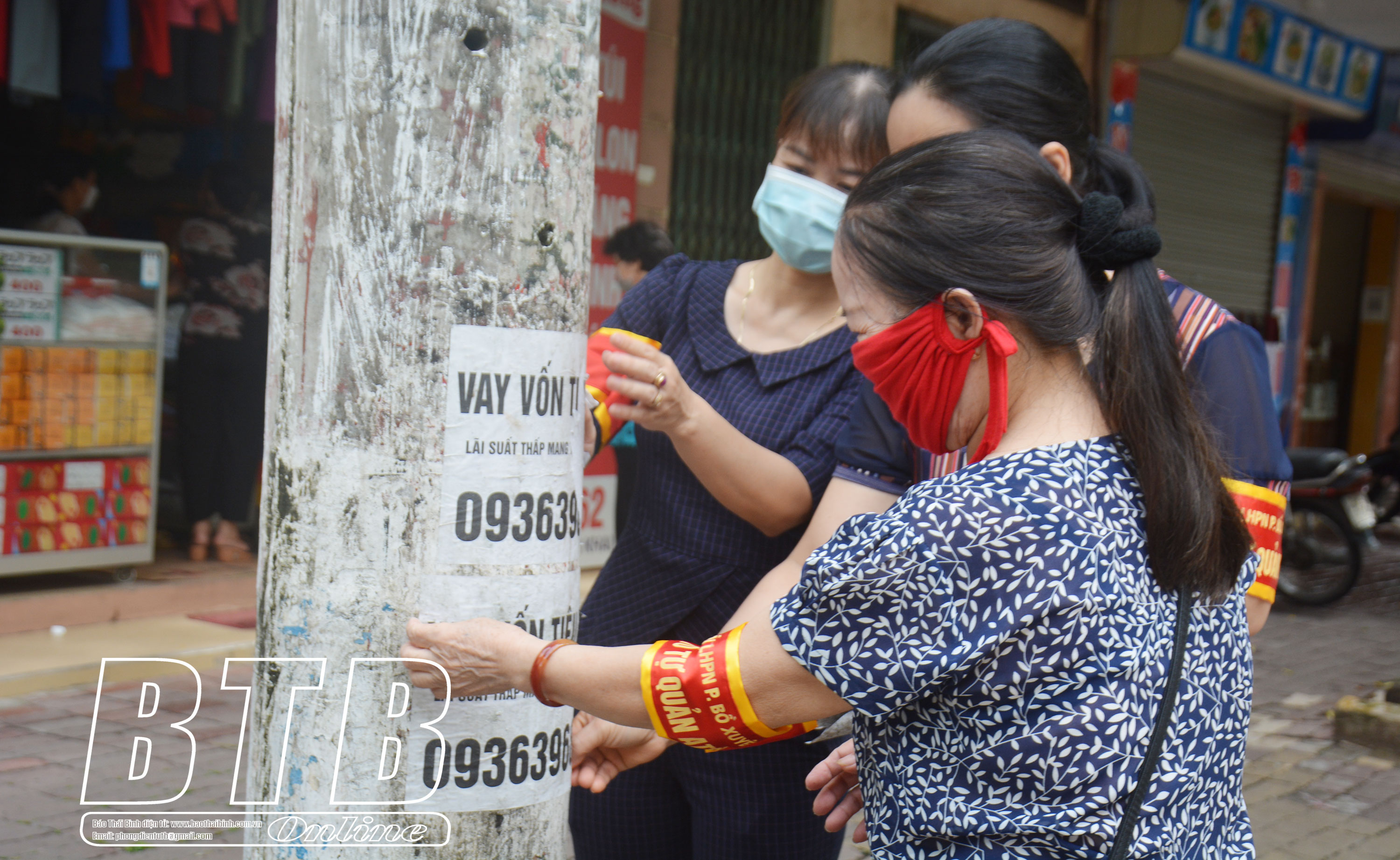 Phụ nữ phường Bồ Xuyên (thành phố Thái Bình) bóc quảng cáo, rao vặt trái phép.