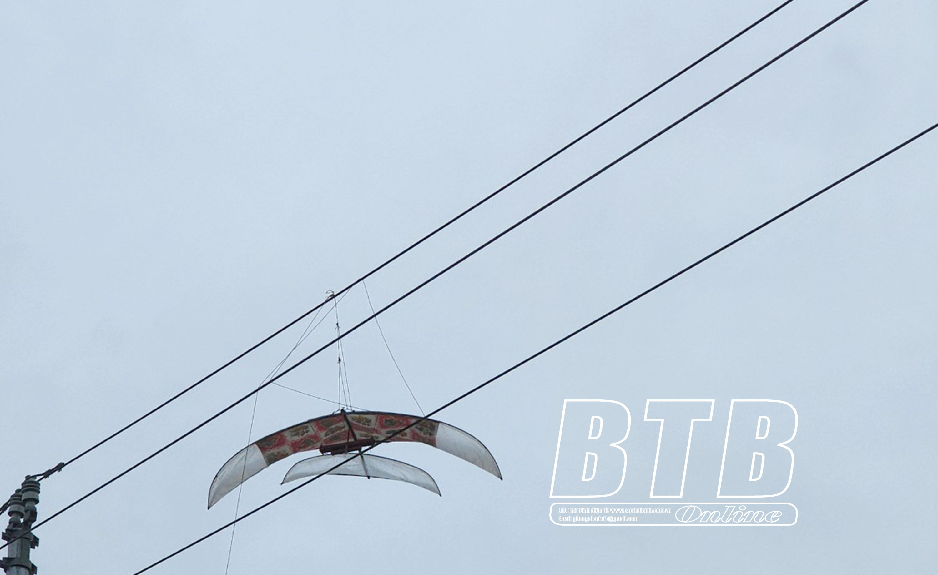 Một chiếc diều mắc trên hệ thống lưới điện trung áp thuộc địa bàn xã Thụy Văn.