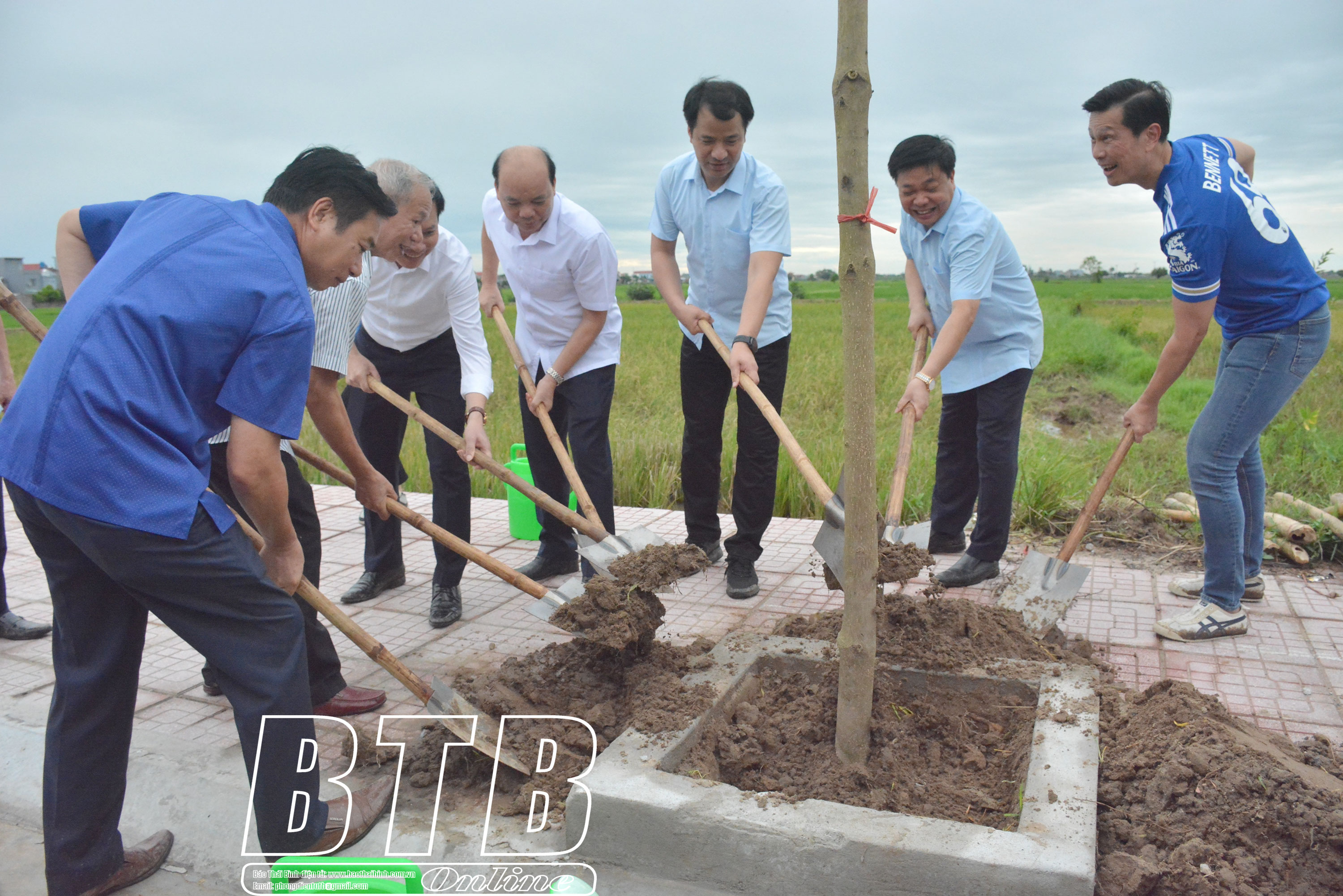 Các đồng chí lãnh đạo Trung ương Đoàn, tỉnh Thái Bình, Tổng công ty Cổ phần Bia - Rượu - Nước giải khát Sài Gòn trồng cây tại khu vực ngoài sân thể thao cộng đồng xã Đông Xá.