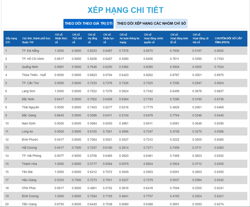 10 các tỉnh, thành phố có chỉ số DTI đứng đầu gồm: Đà Nẵng, TP Hồ Chí Minh, Quảng Ninh, Thừa Thiên Huế, Cần Thơ, Lạng Sơn, Bắc Ninh, Thái Nguyên, Bắc Giang, Nam Định.
