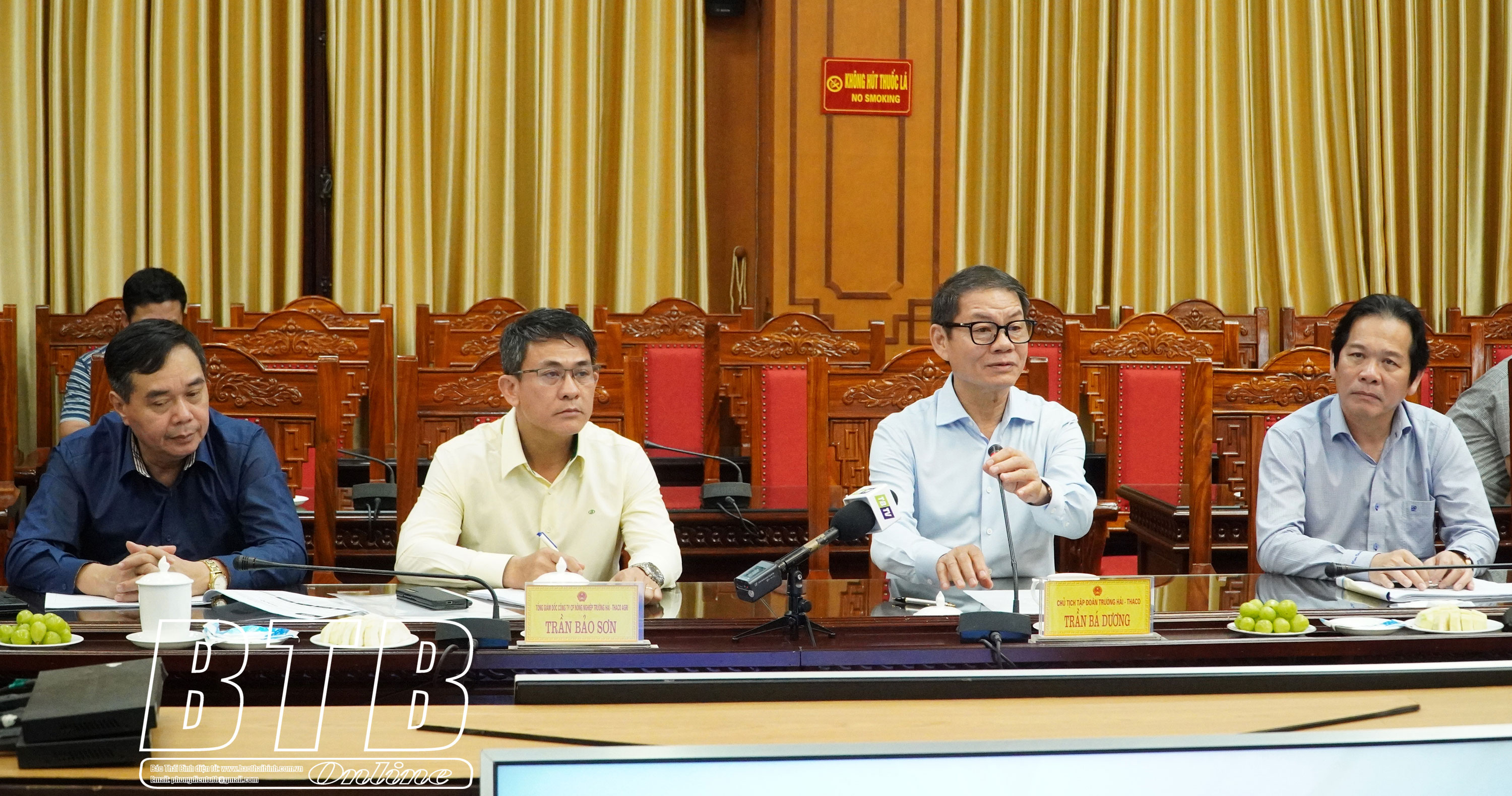 Lãnh đạo Ban Quản lý Khu kinh tế và các khu công nghiệp tỉnh phát biểu tại buổi làm việc. Ông Trần Bảo Sơn, Tổng Giám đốc Công ty Cổ phần Nông nghiệp Trường Hải – Thaco Agri chia sẻ về chiến lược đầu tư vào KCN Thaco - Thái Bình.