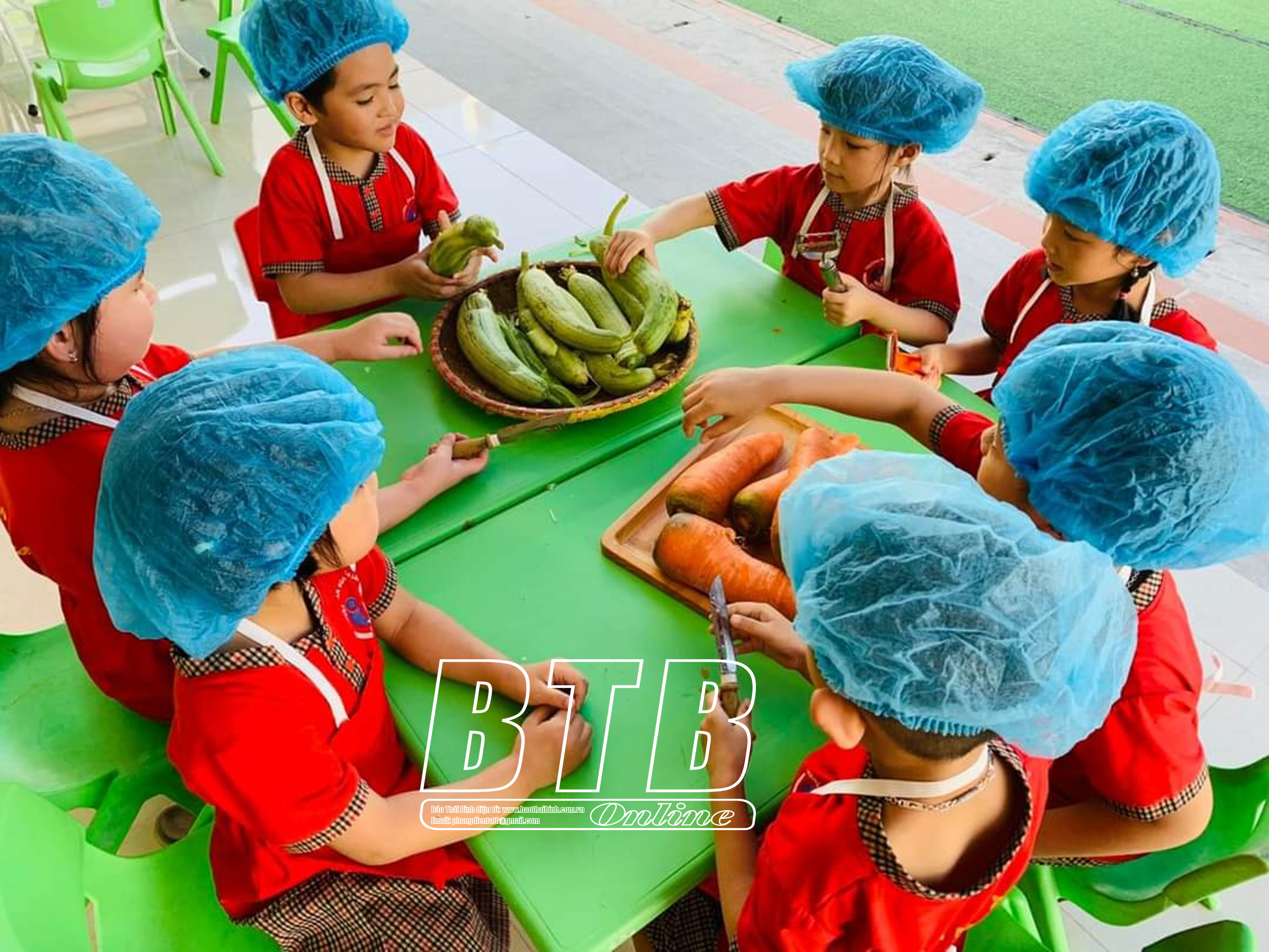 Học sinh Trường Mầm non Trần Lãm (thành phố Thái Bình) thực hành trải nghiệm gọt củ quả.