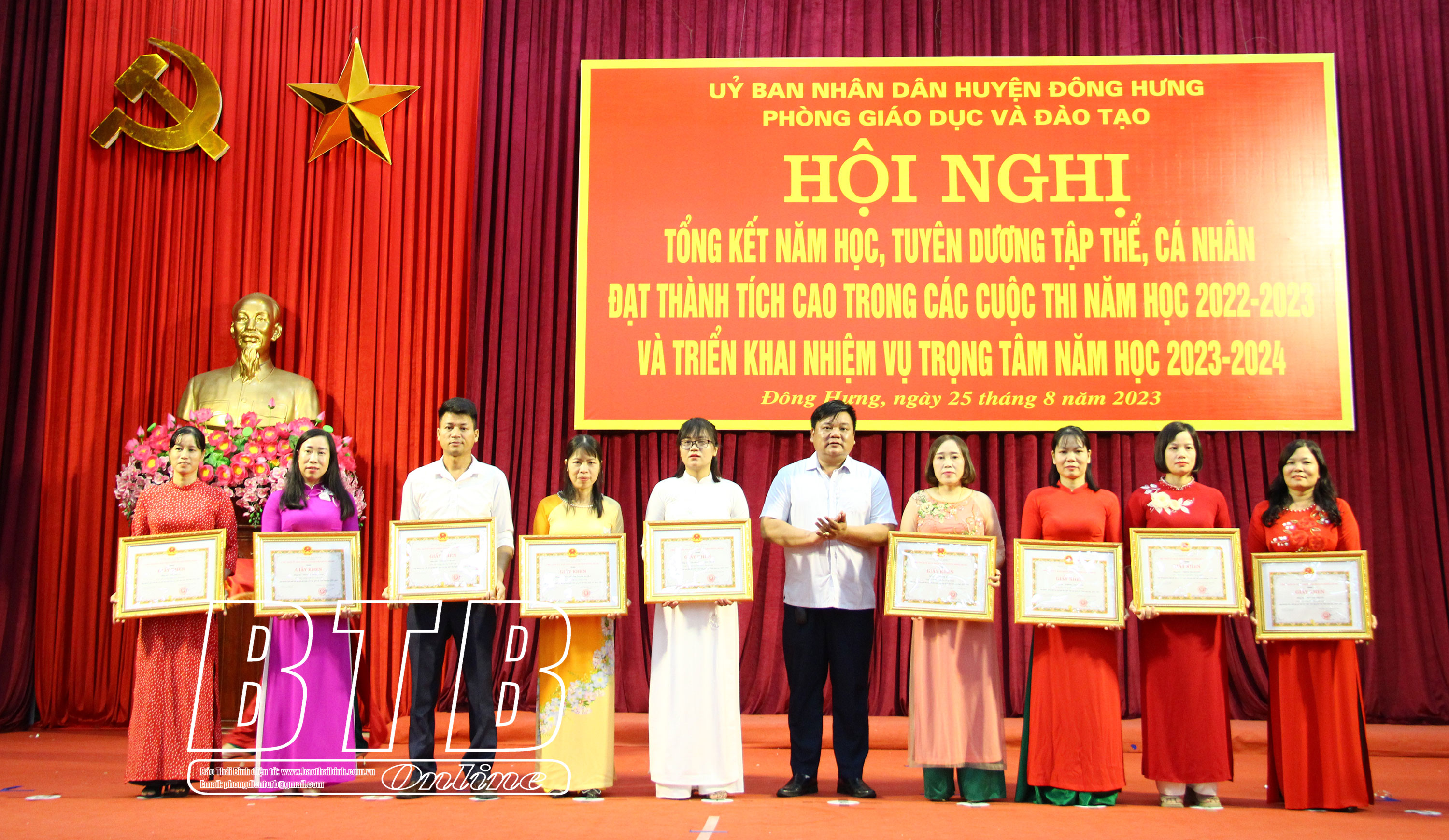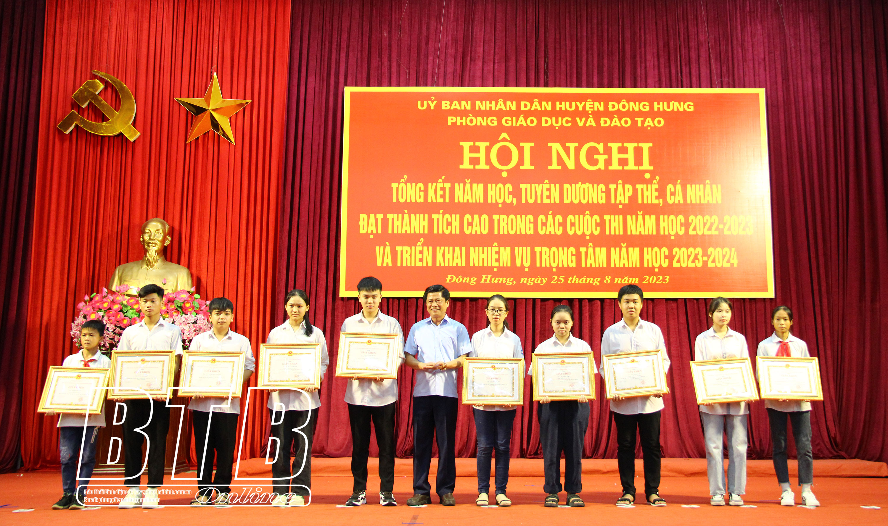 Tại hội nghị, UBND huyện Đông Hưng đã tuyên dương, khen thưởng trên 400 tập thể, cá nhân đạt thành tích cao trong các cuộc thi năm học 2022 - 2023.