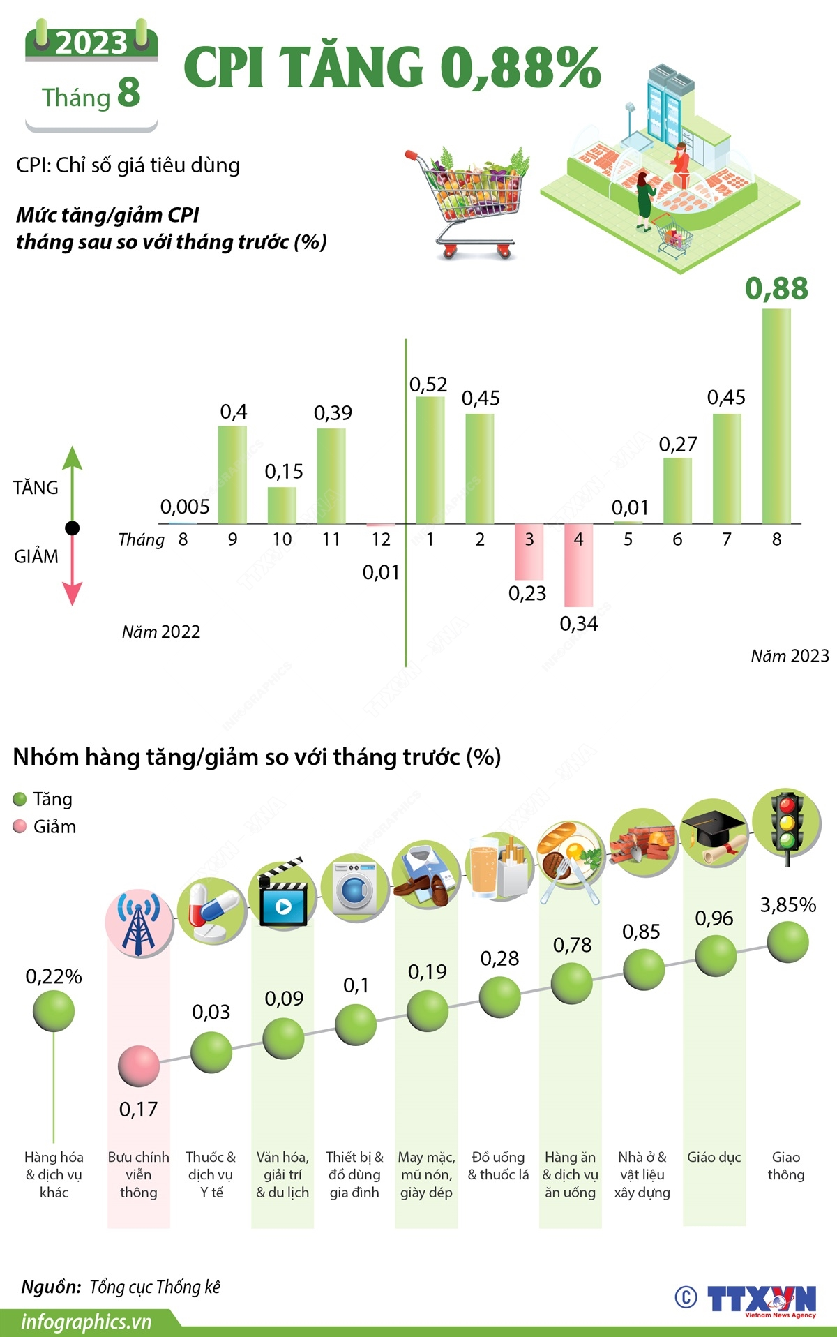 CPI tháng 8/2023 tăng 0,88%