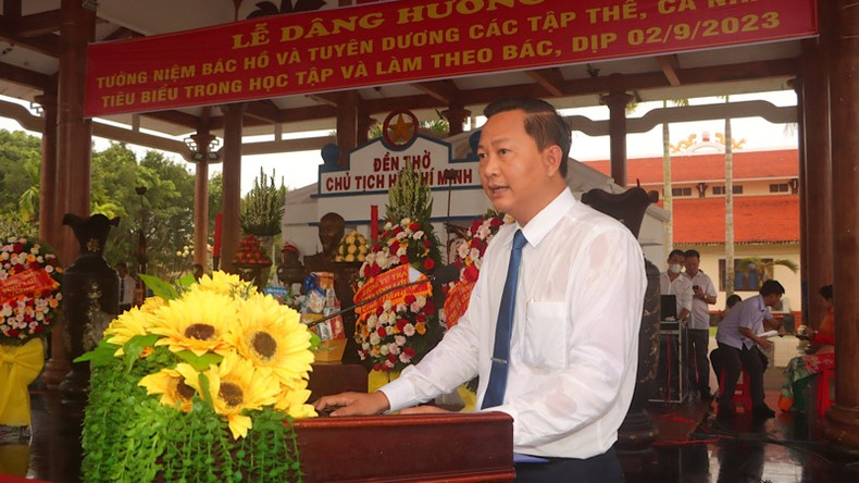 Đồng chí Trương Thanh Nhã, Bí thư Huyện ủy Vĩnh Lợi (Bạc Liêu), phát biểu tại lễ dâng hương và báo công với Bác Hồ tại đền thờ Bác ở xã Châu Thới.