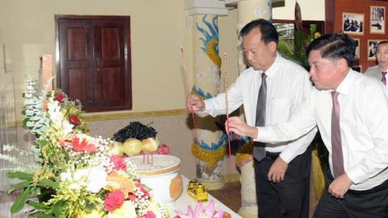Đồng chí Trần Thanh Mến, Bí thư Huyện ủy Đông Hải và đồng chí Lê Minh Hải, Bí thư Thị ủy Giá Rai thắp hương tại đền thờ Bác Hồ ở xã Long Điền, huyện Đông Hải, tỉnh Bạc Liêu.