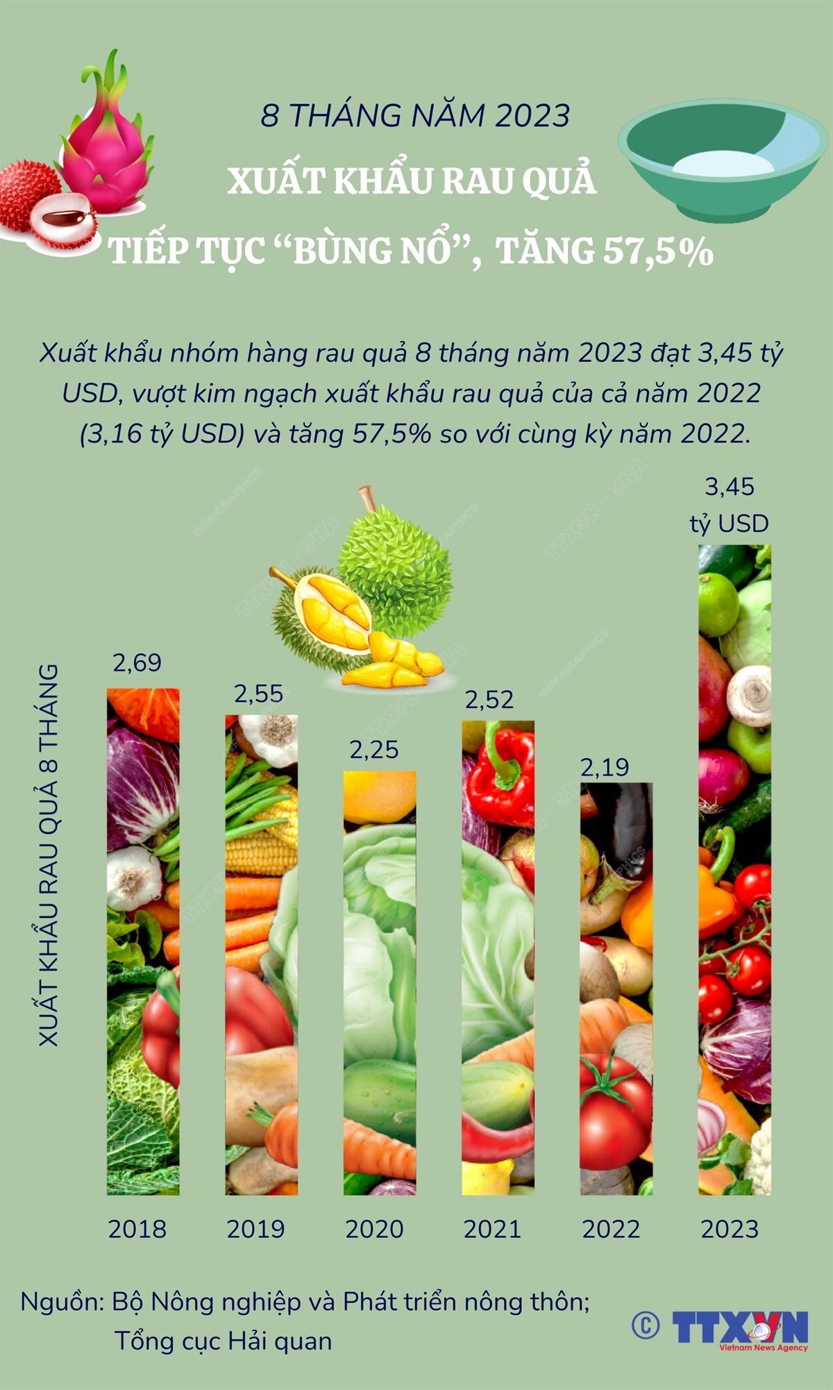 Xuất khẩu nhóm hàng rau quả 8 tháng năm 2023 đạt 3,45 tỷ USD, vượt kim ngạch xuất khẩu rau quả của cả năm 2022 (3,16 tỷ USD) và tăng 57,5% so với cùng kỳ năm 2022.