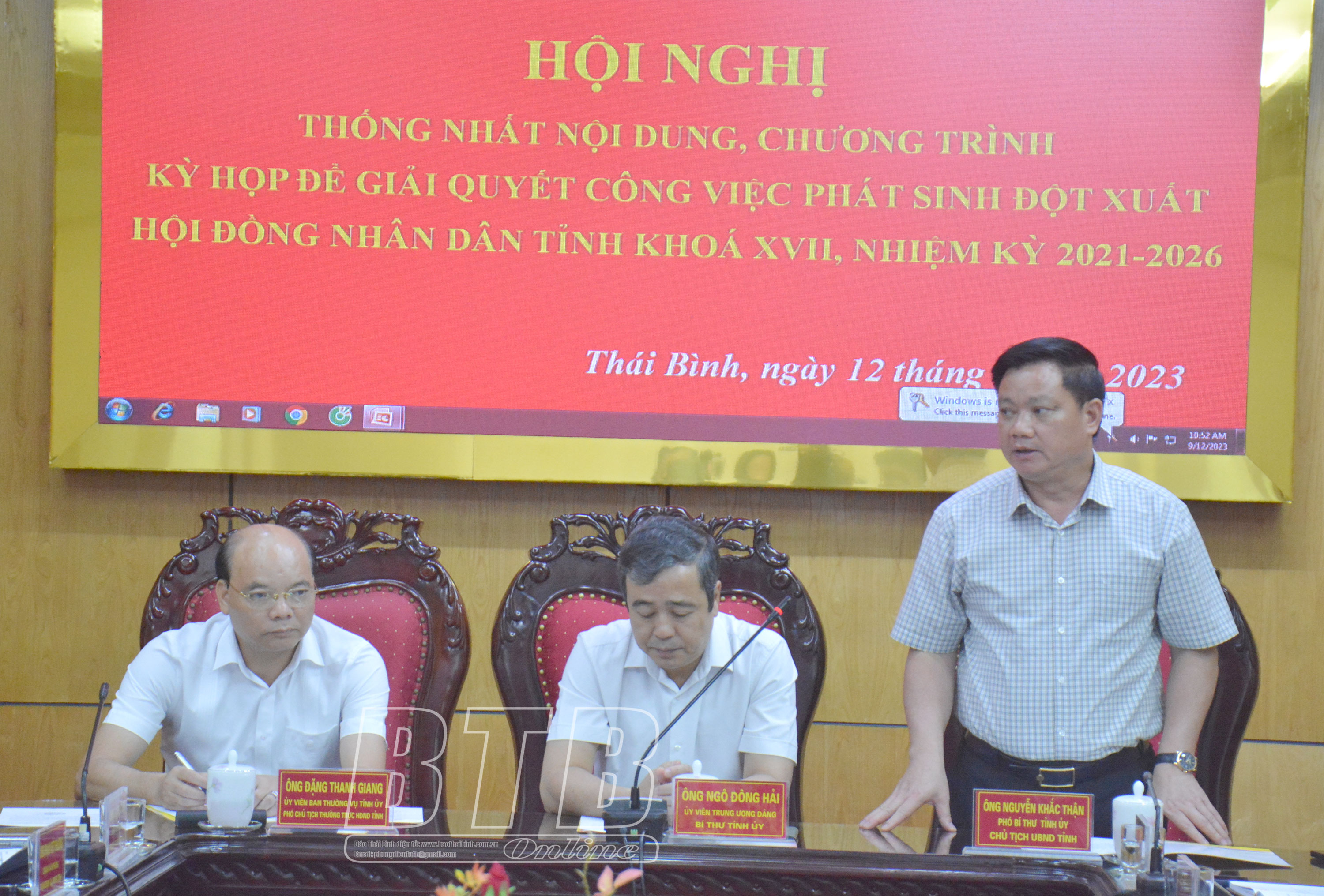 Đồng chí Nguyễn Khắc Thận, Phó Bí thư Tỉnh ủy, Chủ tịch UBND tỉnh phát biểu làm rõ thêm nội dung liên quan đến các tờ trình trình kỳ họp; đồng thời đề nghị bổ sung tờ trình quy định mức thu học phí đối với các cơ sở giáo dục trên địa bàn tỉnh Thái Bình; hỗ trợ du học sinh (các tỉnh mà Thái Bình đã ký kết hợp tác) đang học tập ở Thái Bình.