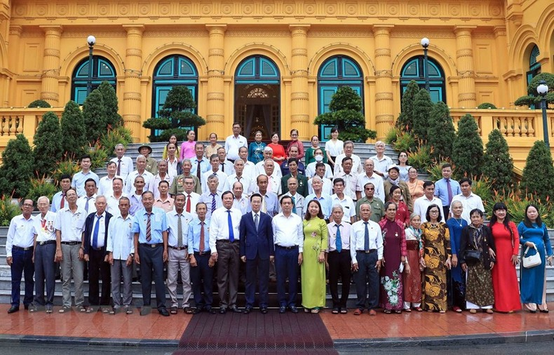 Chủ tịch nước Võ Văn Thưởng chụp ảnh lưu niệm với đoàn đại biểu người có công với cách mạng của tỉnh Trà Vinh. (Ảnh: An Đăng/TTXVN).