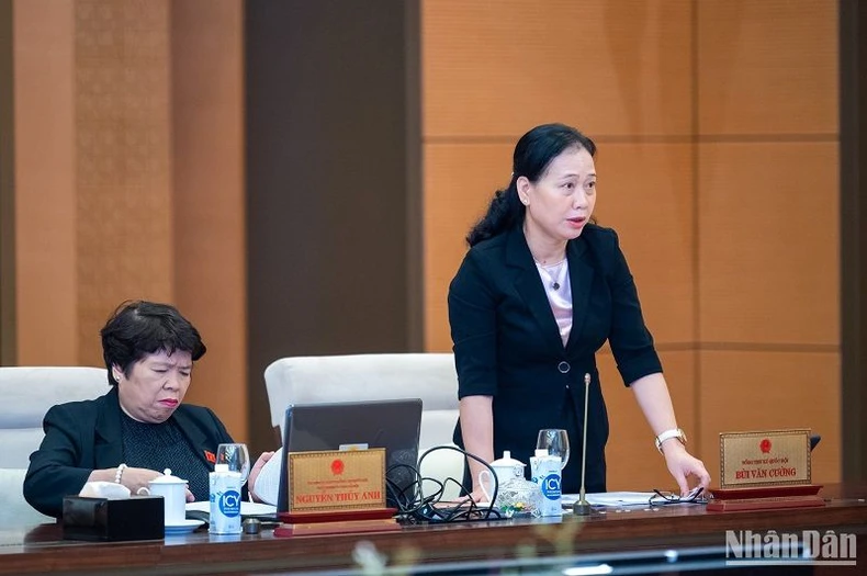 Phó Chủ nhiệm Văn phòng Quốc hội Nguyễn Thị Thúy Ngần báo cáo tóm tắt tổng hợp nội dung thẩm tra của các cơ quan Quốc hội. (Ảnh: DUY LINH).