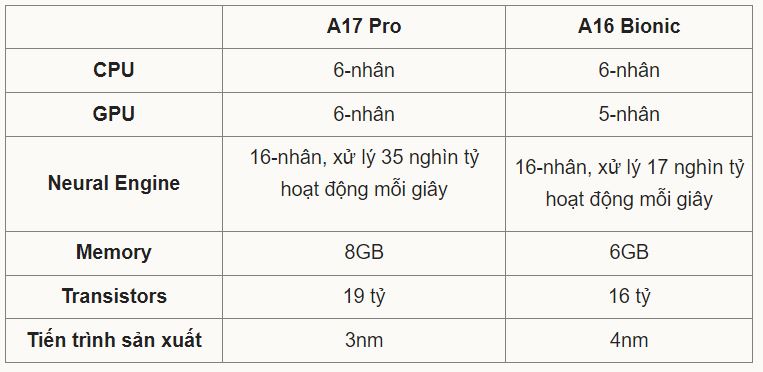 Apple không chia sẻ so sánh hiệu suất giữa hai mẫu chip A17 Pro và A16 Bionic, nên có thể hiệu suất giữa hai mẫu chip này không chênh lệch hoặc thậm chí ngang nhau.