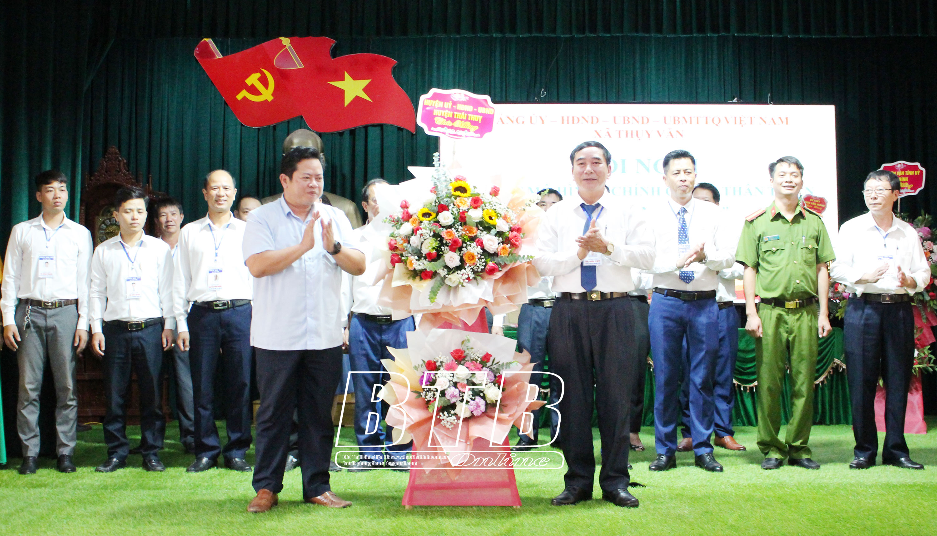 Lãnh đạo UBND huyện Thái Thụy tặng hoa chúc mừng.