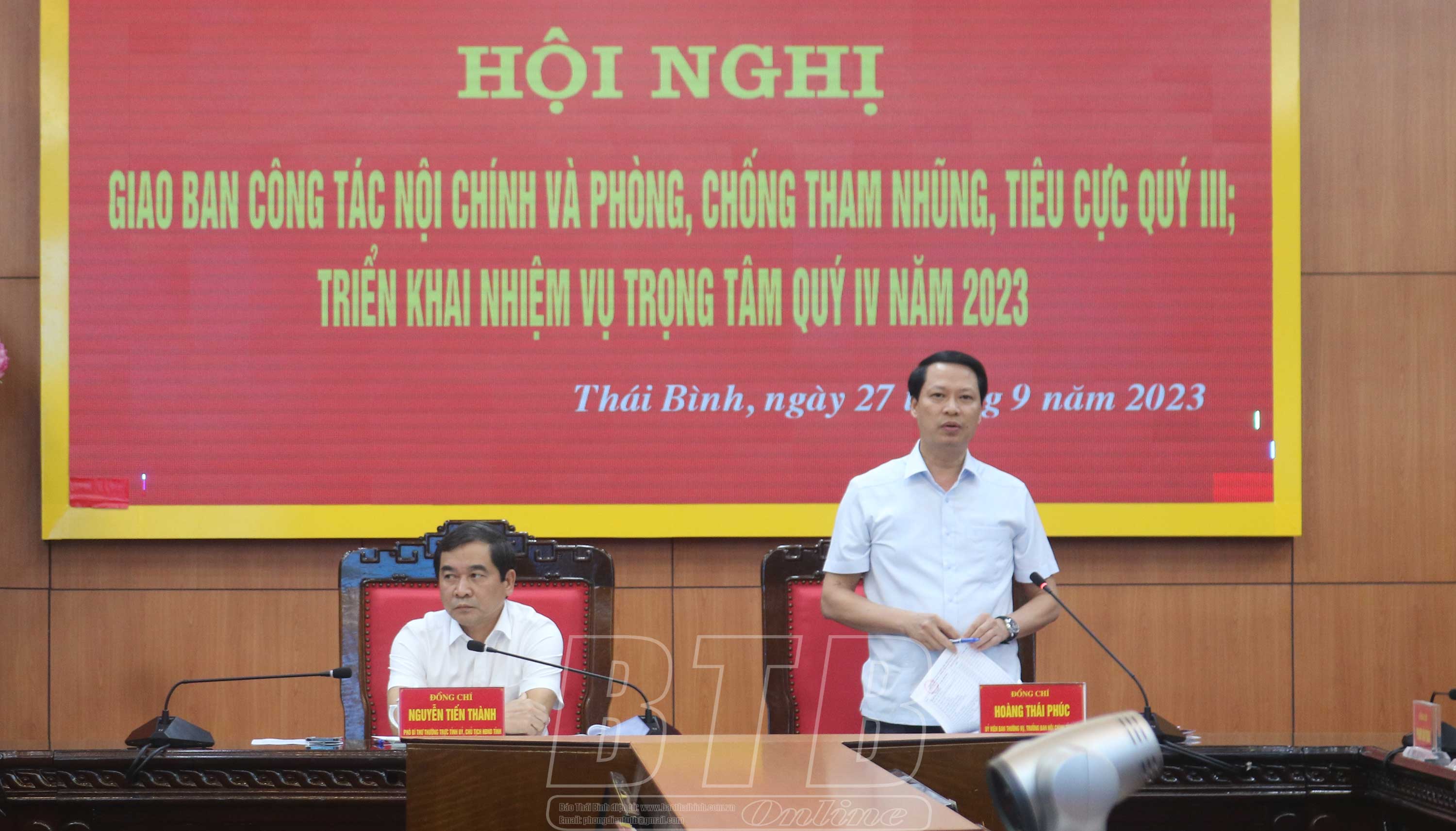 Các đồng chí: Nguyễn Tiến Thành, Phó Bí thư thường trực Tỉnh ủy, Chủ tịch HĐND tỉnh; Hoàng Thái Phúc, Ủy viên Ban Thường vụ, Trưởng ban Nội chính Tỉnh ủy chủ trì hội nghị. Dự hội nghị có các đồng chí Ủy viên Ban Thường vụ Tỉnh ủy, lãnh đạo HĐND, UBND tỉnh; thủ trưởng các sở, ban, ngành; bí thư các huyện ủy, thành ủy, đảng ủy trực thuộc Tỉnh ủy; chủ tịch UBND các huyện, thành phố.
