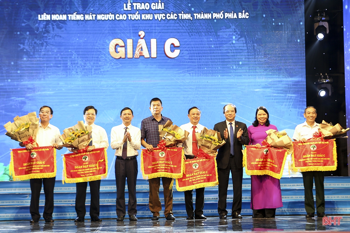 Phó Chủ tịch Trung ương Hội Người cao tuổi Việt Nam Trương Xuân Cừ, Phó Chủ tịch UBND tỉnh Hà Tĩnh Lê Ngọc Châu trao giải C cho các đoàn.