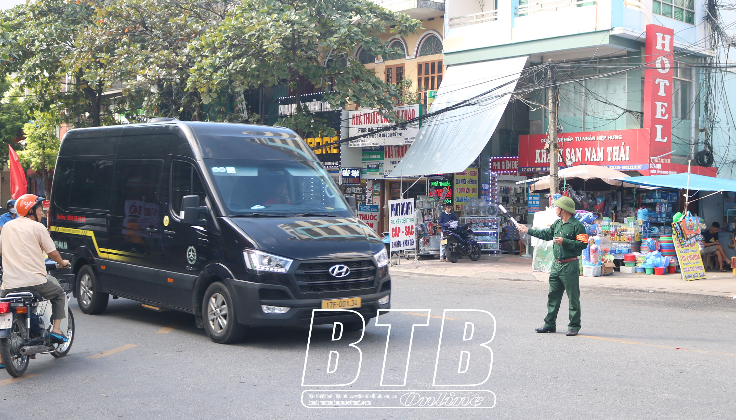 Thành viên tổ tự quản về an toàn giao thông tham gia phân luồng giao thông trước cổng Bệnh viện Phụ sản Thái Bình.