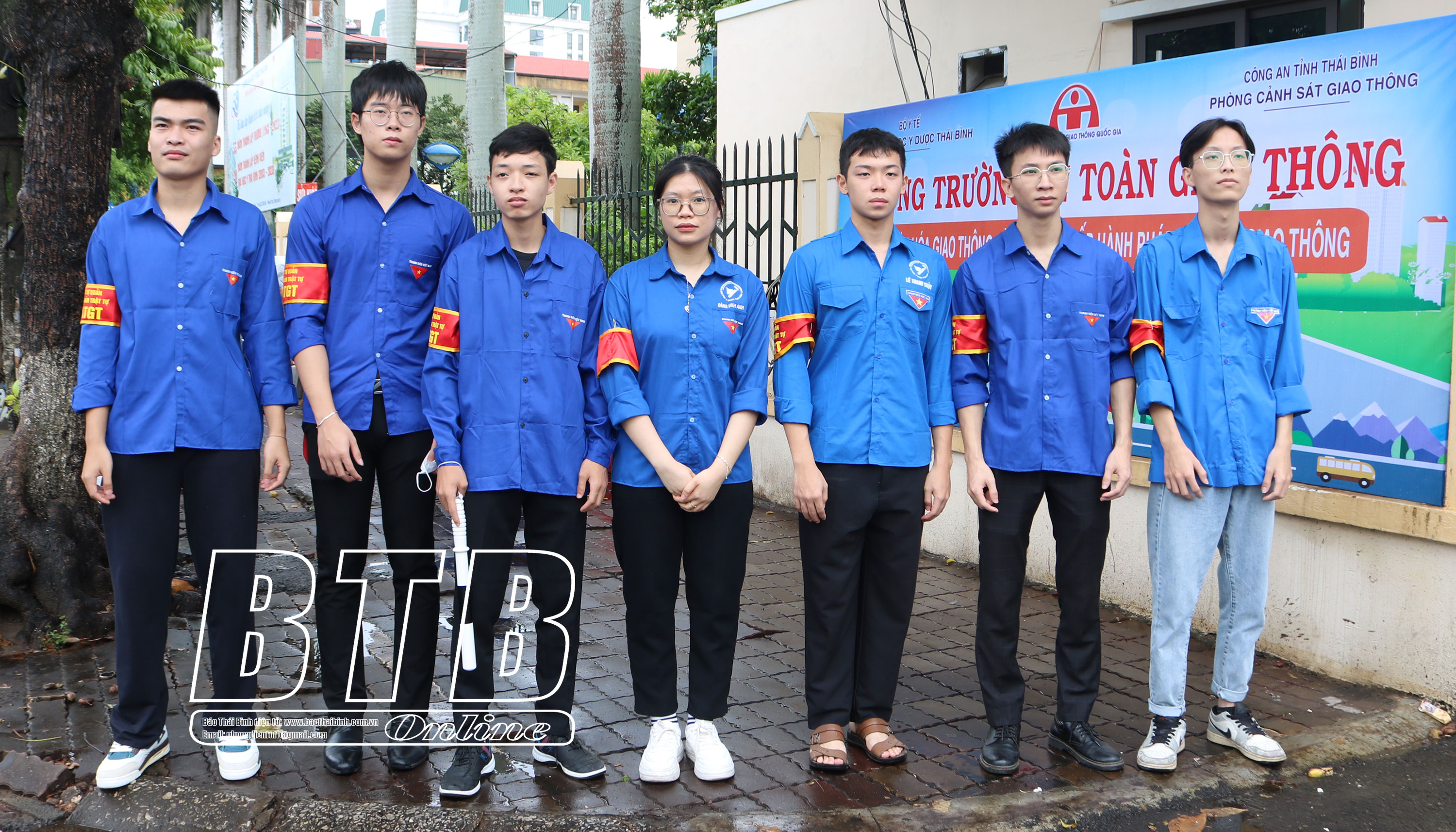 Đội tự quản an toàn giao thông Trường Đại học Y Dược Thái Bình bảo đảm an toàn cổng trường trong giờ cao điểm.