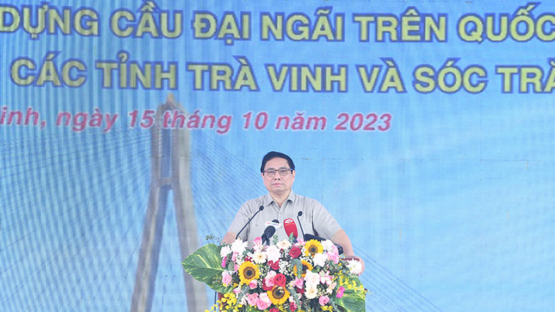 Phát biểu ý kiến tại buổi lễ, Thủ tướng Phạm Minh Chính nhấn mạnh, Đảng, Nhà nước luôn dành nguồn lực lớn cho phát triển hạ tầng giao thông, trong đó có vùng đồng bằng sông Cửu Long. Chúng ta đã bố trí nguồn lực thực hiện và phối hợp Trung ương và địa phương để làm việc này, đây là cách làm mới và đang chứng minh hiệu quả nhờ huy động sức mạnh tổng hợp của cả hệ thống chính trị, nhân dân, doanh nghiệp với trọng tâm, trọng điểm, quyết liệt thực hiện; thường xuyên tháo gỡ các khó khăn, vướng mắc; kiểm tra, giám sát, kiểm toán chống tiêu cực, lãng phí, tham nhũng.