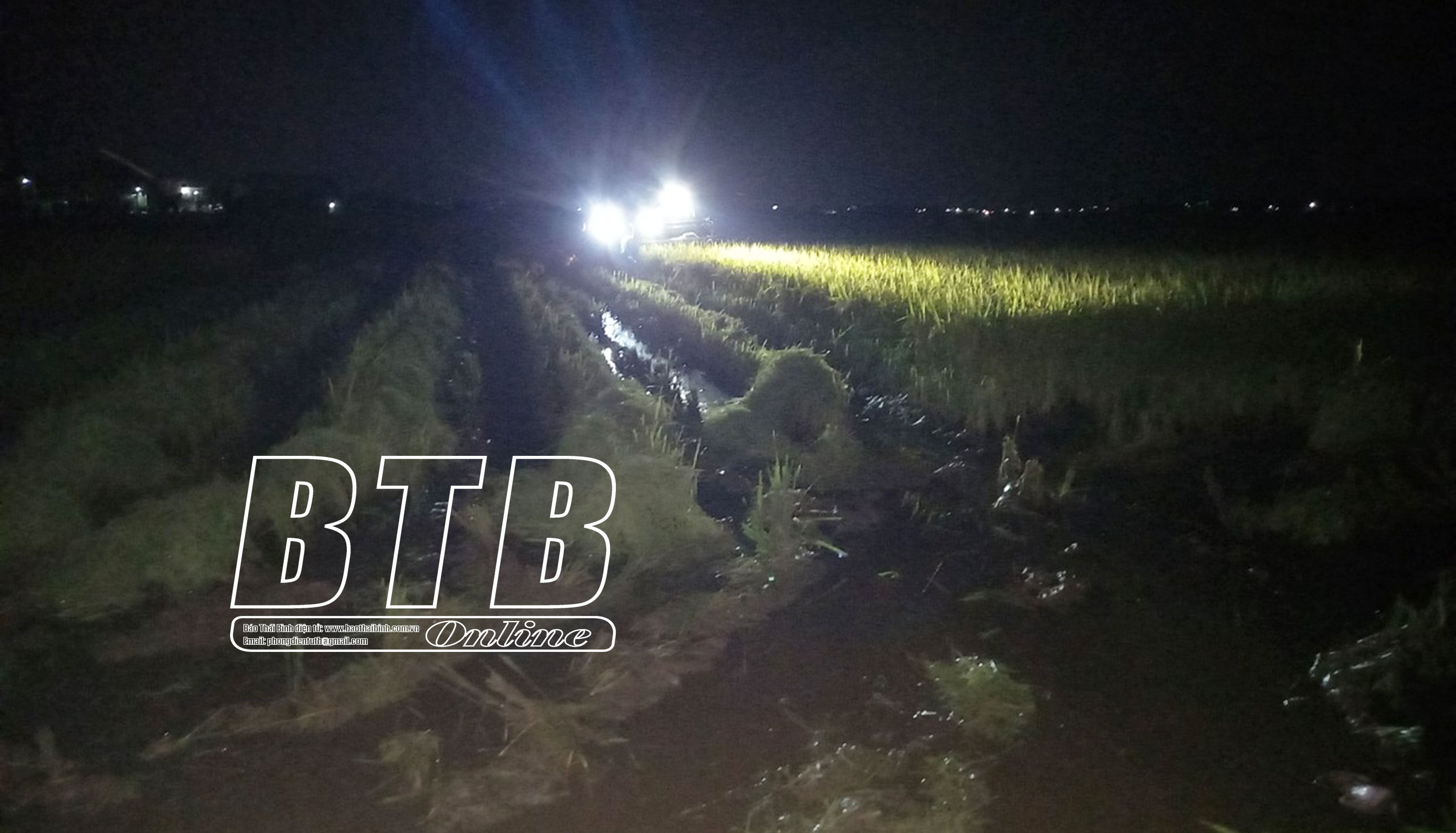 Để đẩy nhanh tiến độ thu hoạch lúa, các chủ máy tổ chức gặt tối tại cánh đồng xã Phú Lương.