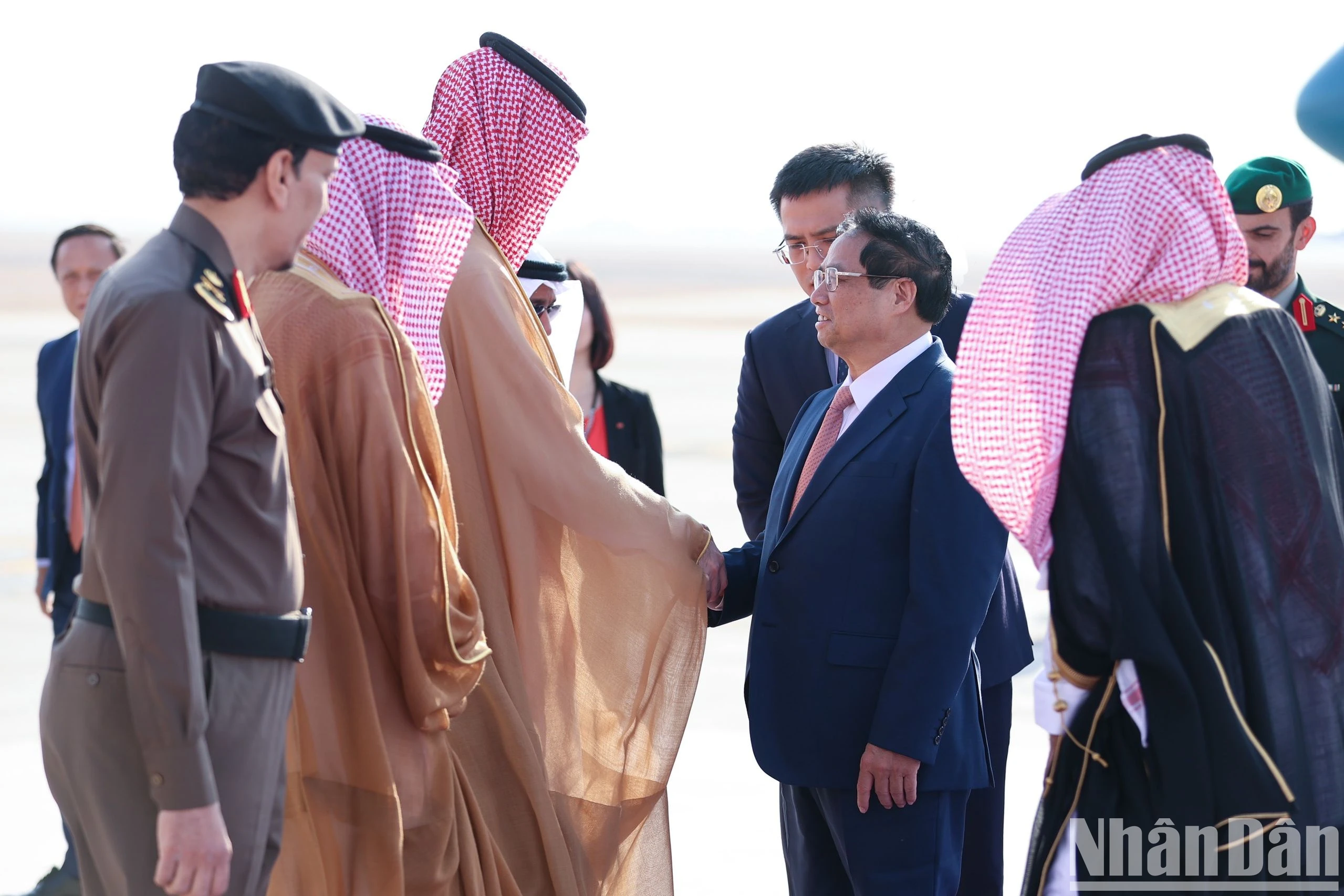 Lễ đón Thủ tướng Phạm Minh Chính và Đoàn đại biểu cấp cao Việt Nam tại sân bay quốc tế Quốc vương Khalid ở thủ đô Riyadh, Saudi Arabia. (Ảnh: Nhật Bắc).
