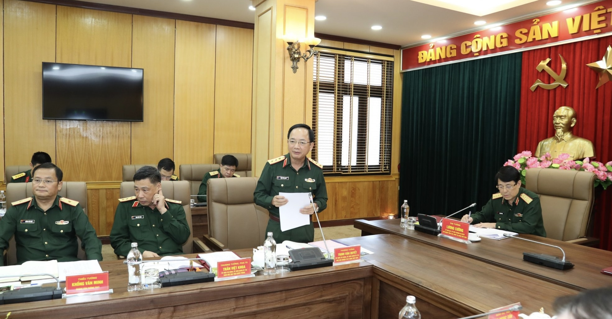 Các đồng chí Ủy viên Bộ Chính trị: Đại tướng Lương Cường, Ủy viên Thường vụ Quân ủy Trung ương, Chủ nhiệm Tổng cục Chính trị Quân đội nhân dân Việt Nam; Giáo sư, Tiến sĩ Nguyễn Xuân Thắng, Chủ tịch Hội đồng Lý luận Trung ương, Giám đốc Học viện Chính trị Quốc gia Hồ Chí Minh, đồng chủ trì hội nghị.