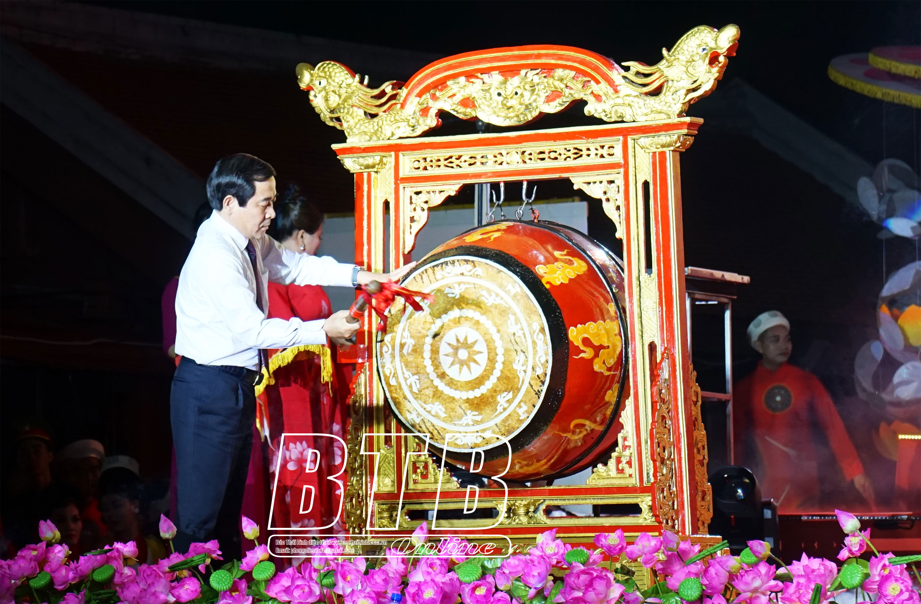 Đồng chí Nguyễn Tiến Thành, Phó Bí thư thường trực Tỉnh ủy, Chủ tịch HĐND tỉnh đánh trống khai hội chùa Keo mùa thu năm 2023.