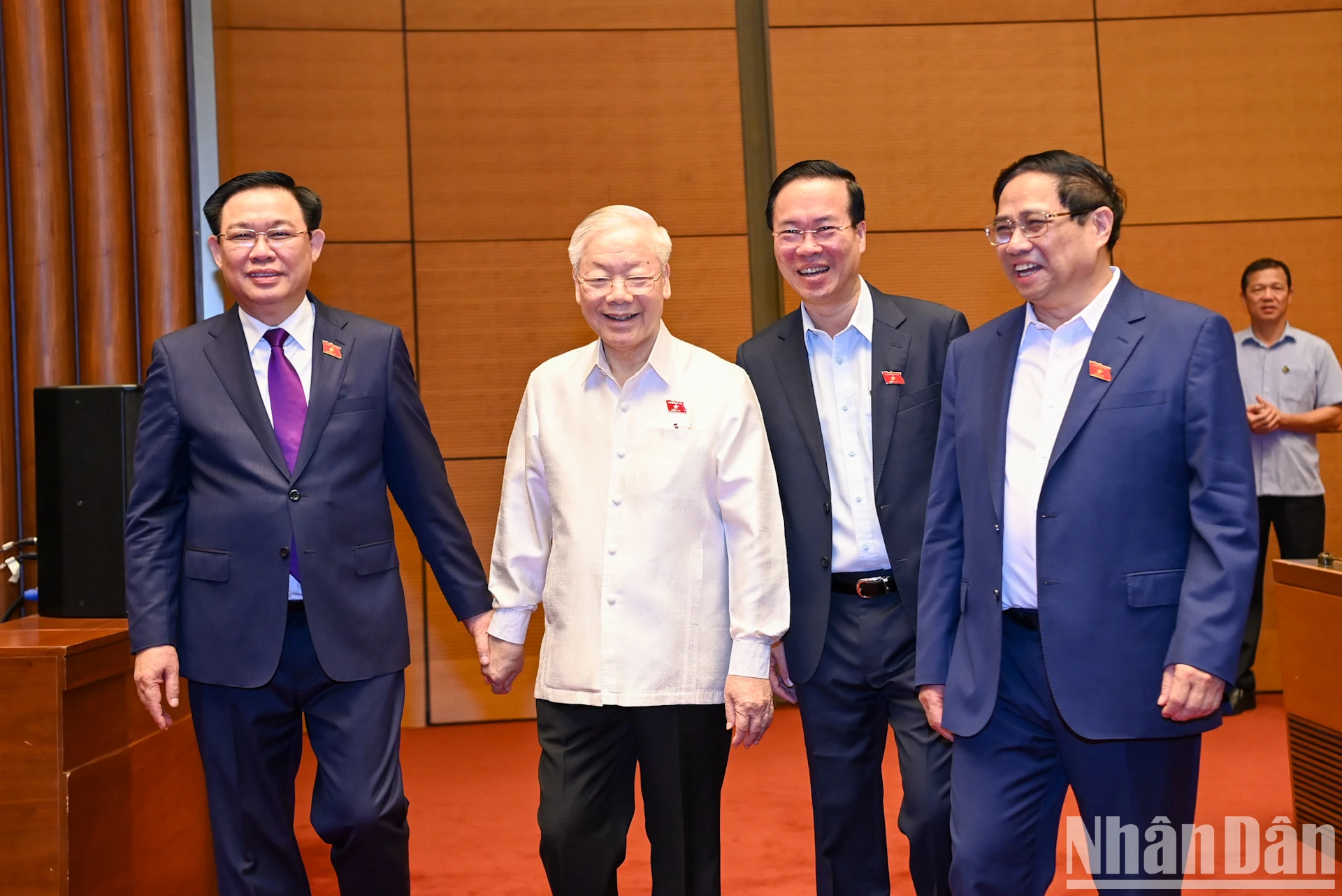 Tổng Bí thư Nguyễn Phú Trọng, Chủ tịch nước Võ Văn Thưởng, Thủ tướng Chính phủ Phạm Minh Chính và Chủ tịch Quốc hội Vương Đình Huệ tại Hội trường Diên Hồng. (Ảnh: DUY LINH).