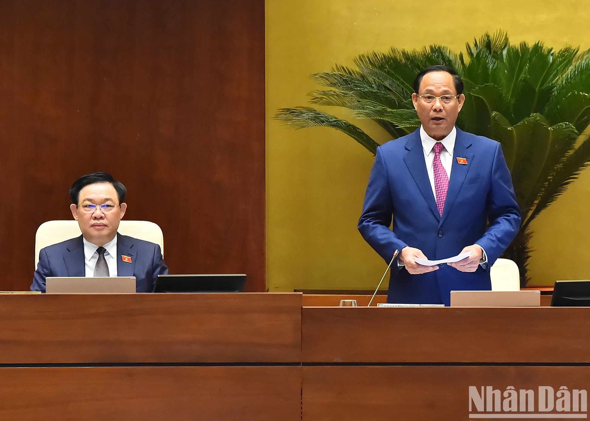 Ủy viên Ủy ban Thường vụ Quốc hội, Chủ nhiệm Ủy ban Quốc phòng và An ninh của Quốc hội Lê Tấn Tới trình bày Báo cáo giải trình, tiếp thu, chỉnh lý dự thảo Luật Lực lượng tham gia bảo vệ an ninh, trật tự ở cơ sở. (Ảnh: THỦY NGUYÊN).