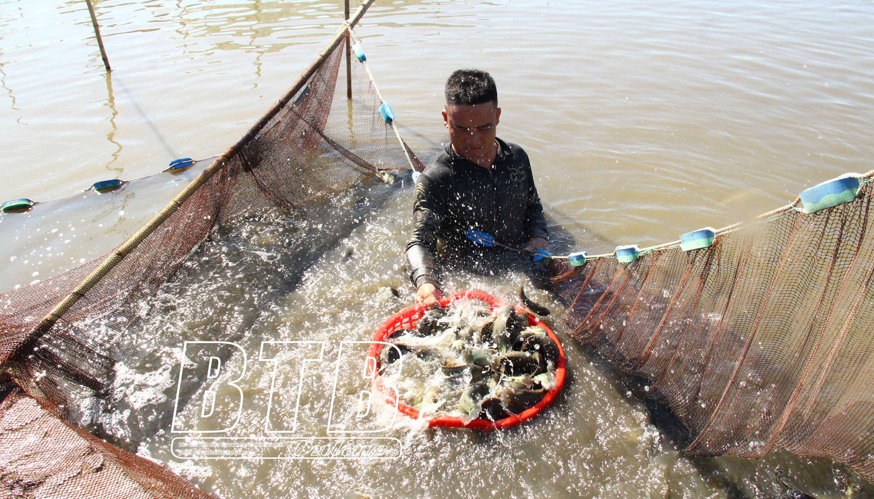 Chúng tôi đến thăm mô hình nuôi ếch kết hợp cá rô của anh Công đúng ngày anh xuất cá. Hàng tấn cá rô kéo lên đều được các thương lái khắp nơi đến thu mua hết, anh không phải lo đầu ra.