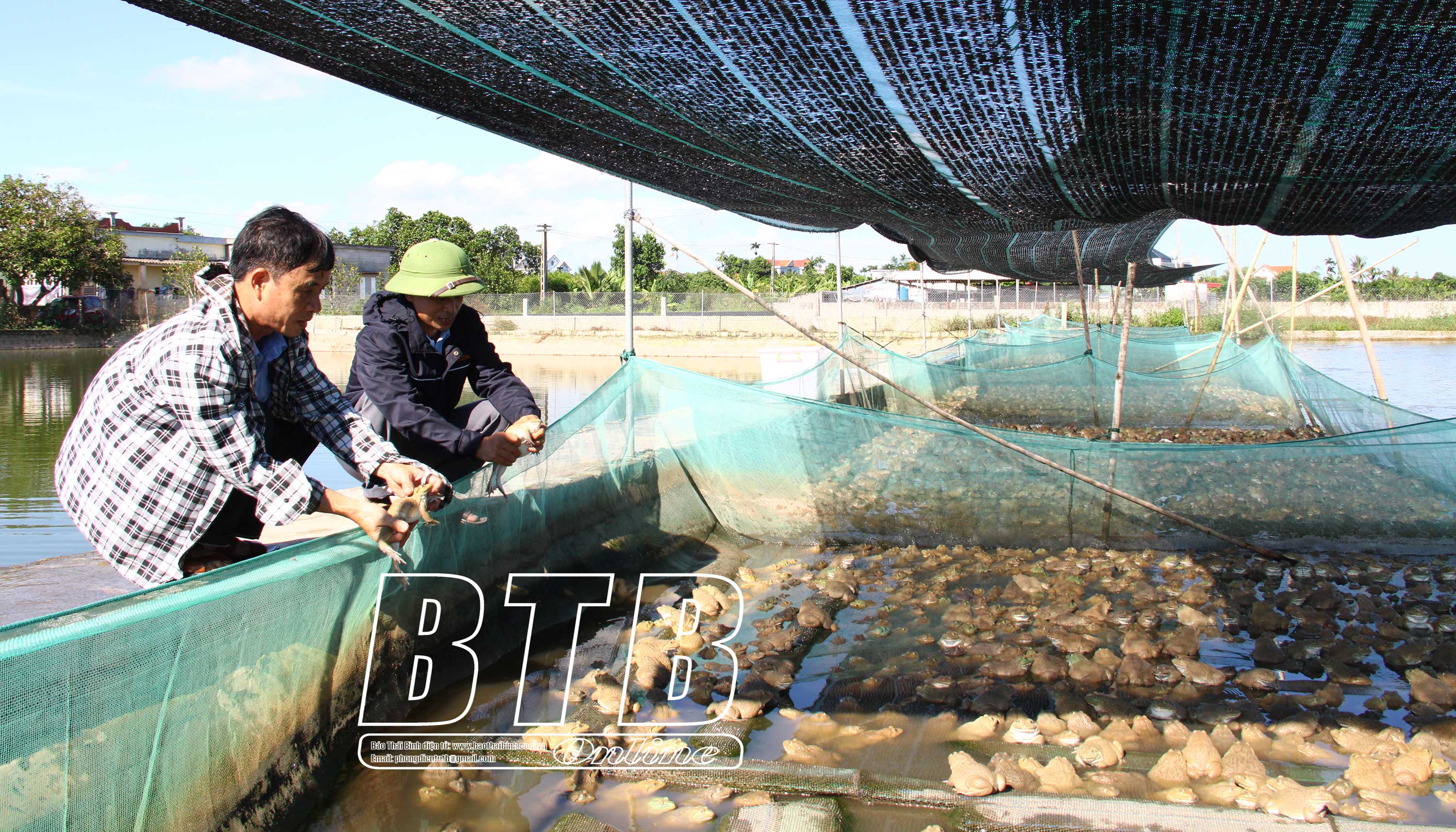 Trước khi đến với nghề nuôi ếch, cá, anh Công đã phải làm nhiều nghề khác nhau nhưng thu nhập thấp, kinh tế gia đình vẫn khó khăn. Cách đây 3 năm, anh xin ra vùng nuôi trồng thủy sản tập trung của xã chuyển đổi ruộng lúa kém hiệu quả, đào ao nuôi ếch trong lồng lưới trên mặt ao kết hợp nuôi cá rô dưới ao đem lại hiệu quả kinh tế cao cho gia đình. Trên diện tích 10.000m2 anh đào 3 ao thả cá, ếch, xây các ngăn chuồng ương ếch giống, cá rô giống. Anh chia sẻ: Nuôi kết hợp ếch, cá có nhiều lợi ích, nhất là tiết kiệm chi phí, diện tích nuôi. Ếch lột da và thức ăn thừa của ếch đều được cá rô bên dưới ăn, bình thường 1 con cá rô ăn hết khoảng 1,5kg cám/lứa, có ếch bên trên thì giảm còn 1,2 - 1,3kg cám. 1 ao tôi thả 12 vạn cá rô. Nuôi ếch hay bị bệnh gan, thận, cá rô thì suất huyết dạ dày, đầu đen. Tôi phòng tránh bệnh cho vật nuôi bằng cách giữ môi trường nước sạch, bơm nước thường xuyên, định kỳ khử khuẩn, bị bệnh thì kịp thời phát hiện, điều trị sớm.