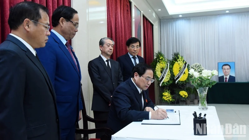 Để bày tỏ niềm thương tiếc và chia buồn về việc đồng chí Lý Khắc Cường, nguyên Ủy viên Thường vụ Bộ Chính trị Trung ương Đảng Cộng sản Trung Quốc, nguyên Thủ tướng Quốc vụ viện nước Cộng hòa nhân dân Trung Hoa từ trần, ngày 1/11, đồng chí Phạm Minh Chính, Ủy viên Bộ Chính trị, Thủ tướng Chính phủ đã dẫn đầu Đoàn đại biểu Đảng, Nhà nước, Chính phủ, Quốc hội, Mặt trận Tổ quốc Việt Nam đến viếng và ghi sổ tang chia buồn tại Đại sứ quán Trung Quốc tại Việt Nam.