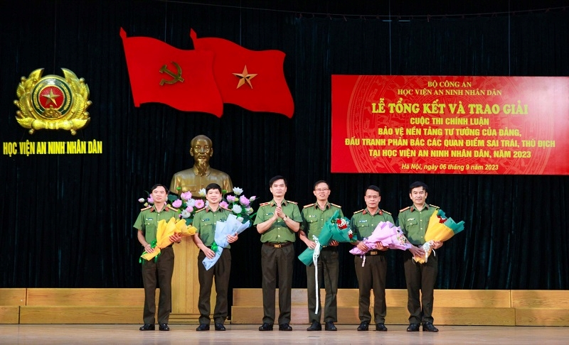 Lãnh đạo Học viện An ninh nhân dân biểu dương các cá nhân tích cực trong Cuộc thi chính luận bảo vệ nền tảng tư tưởng của Đảng, đấu tranh phản bác các quan điểm sai trái, thù địch. (Ảnh: Danh Vỵ).
